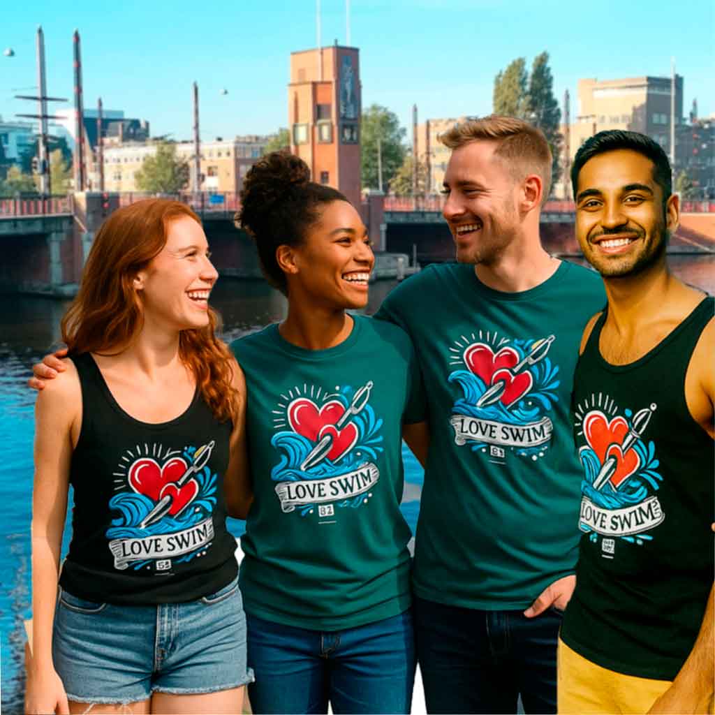 Het ontwerp is rauw en romantisch tegelijk. Een beetje punk, een beetje klassiek. Net als jij misschien. En weet je wat het mooiste is? Als je meedoet aan LoveSwim, krijg je het shirt. Zomaar, voor jou. Omdat jij erbij hoort.
